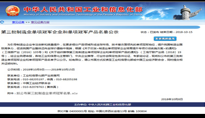 10 月8 日,工业和信息化部产业政策司公布了《关于第三批制造业单项冠军企业和单项冠军产品名单公示》,新疆乐鱼网页版登录入口-乐鱼(中国) 公司根据《关于印发< 制造业单项冠军企业培育提升专项行动实施方案> 的通知》(工信部产业〔2016〕105 号)和《关于组织推荐第三批制造业单项冠军企业和单项冠军产品的通知》(工信厅联产业函〔2018〕19 号)要求,组织材料申报了制造业单项冠军产品- 异亮氨酸,截至目前已顺利通过审核并公示,公示于10 月15 日结束。异亮氨酸单项冠军产品的成功授予, 将形成全球市场、技术等方面领先的单项冠军地位,提升新疆乐鱼网页版登录入口-乐鱼(中国) 公司的国际竞争力。