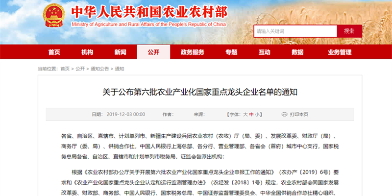 12月3日,农业农村部、国家发展改革委、财政部、商务部、中国人民银行、国家税务总局、中国证券监督管理委员会、中华全国供销合作总社联合印发通知,公布第六批 299 家农业产业化国家重点龙头企业名单,龙江乐鱼网页版登录入口-乐鱼(中国) 公司榜上有名。
